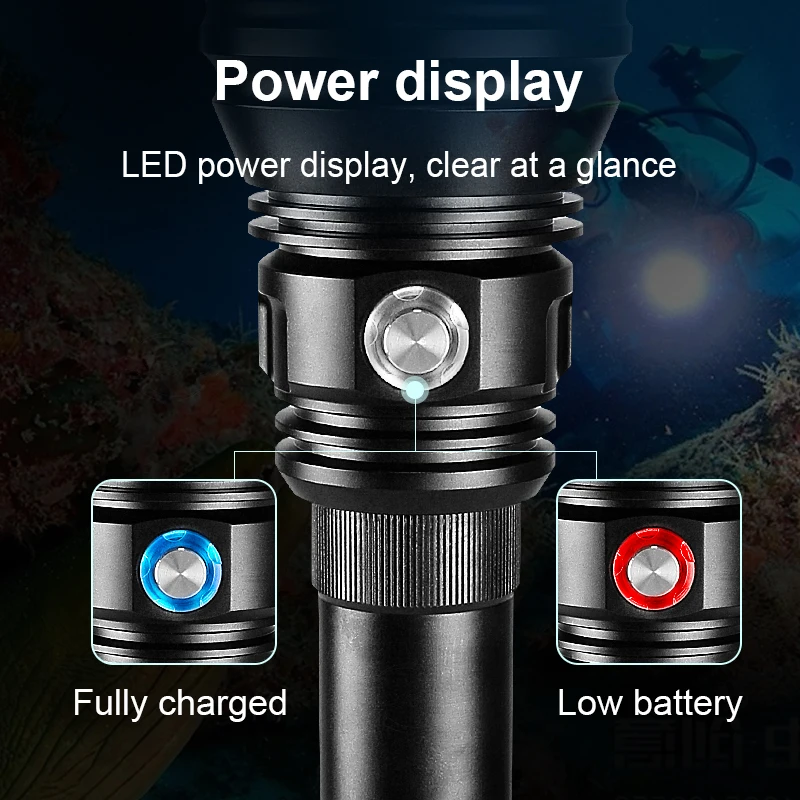 1. Фитиль фонарика: XM L22. Диапазон погружения: 100-250 м3. Режим переключения: 1 режим4. Материал корпуса: алюминиевый сплав5. Уровень водонепроницаемости: IPX-86. Мощность: 18650 или 26650 батарея7. Цвет излучения: белый светильник