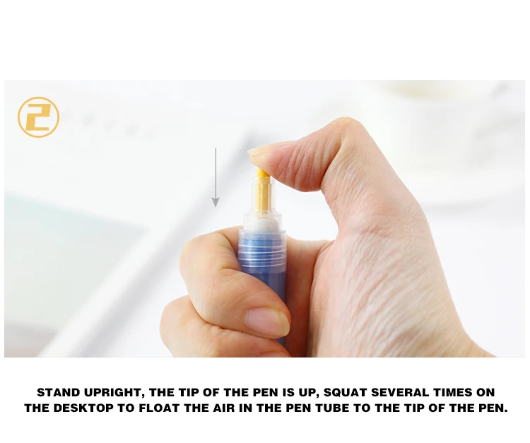 2. Встаньте в вертикальном положении с кончиком ручки вверх, нажмите кончик ручки рукой в течение 3-4 секунд, чтобы отпустить воздух в трубке ручки (новая ручка полностью запечатана, В трубке пера много воздуха, Слишком большое давление приведет к большому количеству выталкивания чернил в использовании).