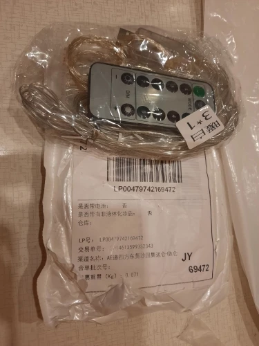 Очень быстрая доставка до Москвы. Туго скручена, надо распрямлять. Проволочки держат форму, не висят свободно, поэтому надо тщательно расправлять, чтобы красиво было. Пульт работает, меняются режимы моргания. В целом неплохо.