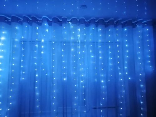 ожидание и реальность, на фото одно пришло другое. длина 1 м, а ширина 3 где то. на фото на всю тюль до пола, здесь не понятно короткие и на большом расстоянии друг от друга лески со светодиодами. заказ шёл 50 дней пришло пол новый год вот это нечто.