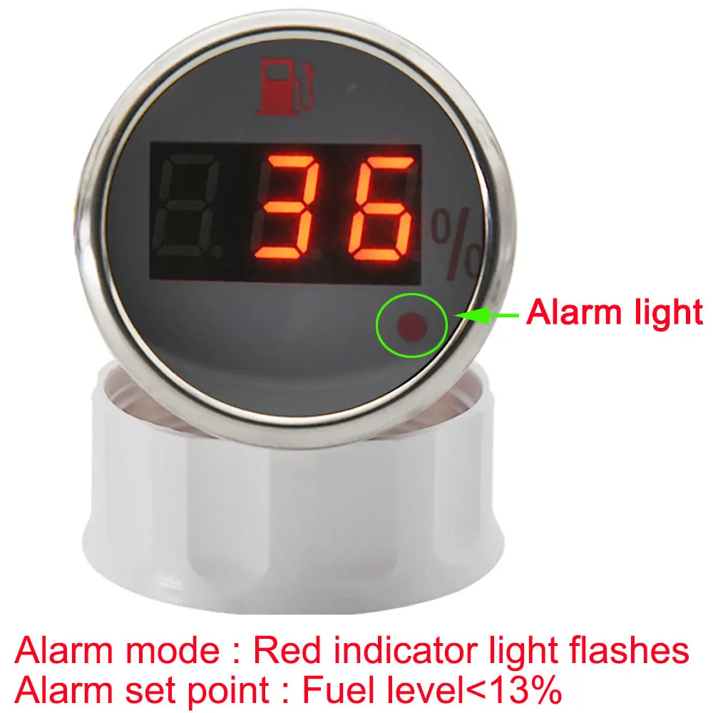 -Цвет лица: белый-Цвет подсветки: красный-Степень защиты: IP67-Входной сигнал: 0 ~ 190 Ом-Рабочее напряжение: 9 ~ 32 В-Материал: пластик, резина, металл-Диаметр установки: Φ52мм (2 ")-Рабочее напряжение: 9-32 в (12 В/24 В)-Предупреждающий сигнал: когда уровень топлива ниже 13%, предупреждающий сигнал мигает ~
