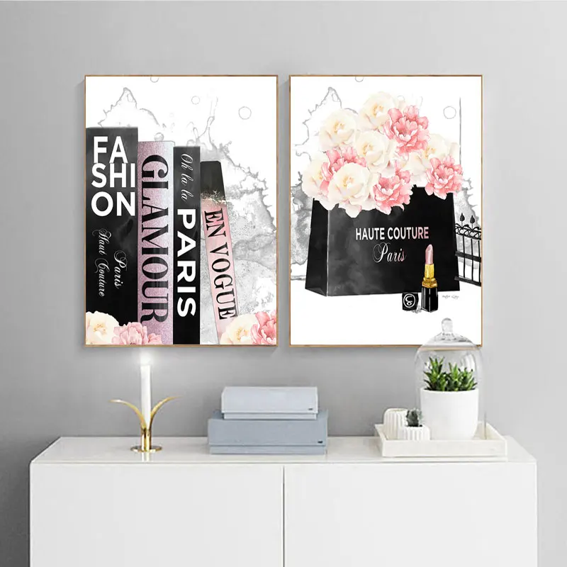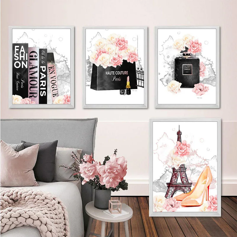 Модная девушка Париж духи губная помада цветок настенная живопись А...