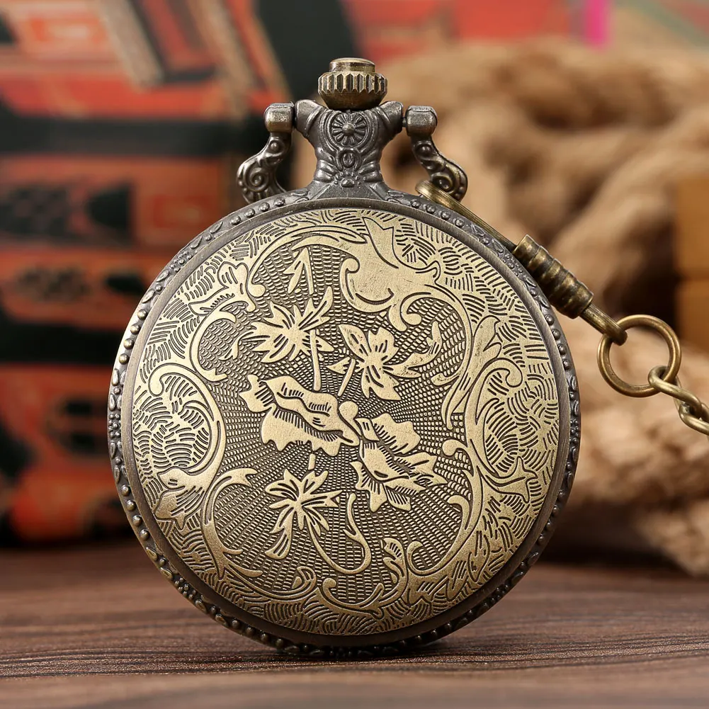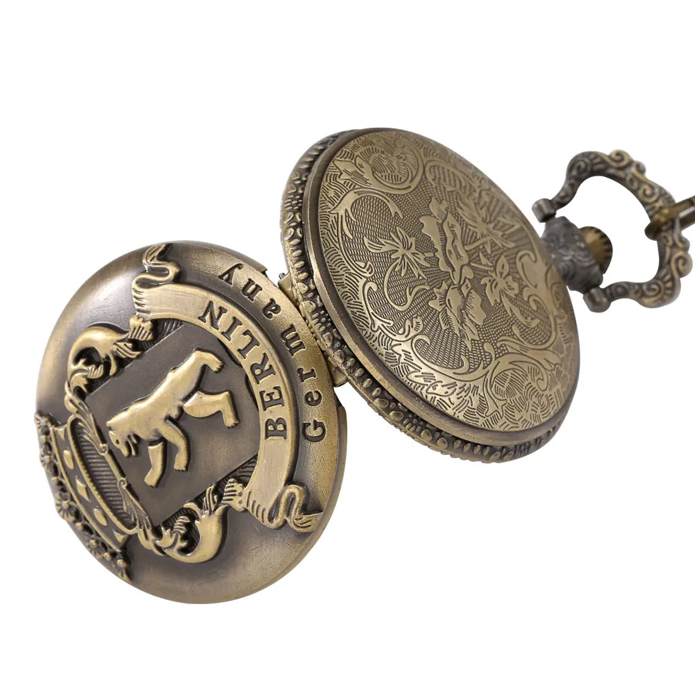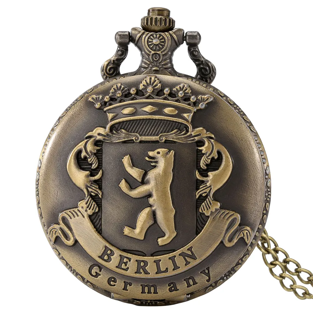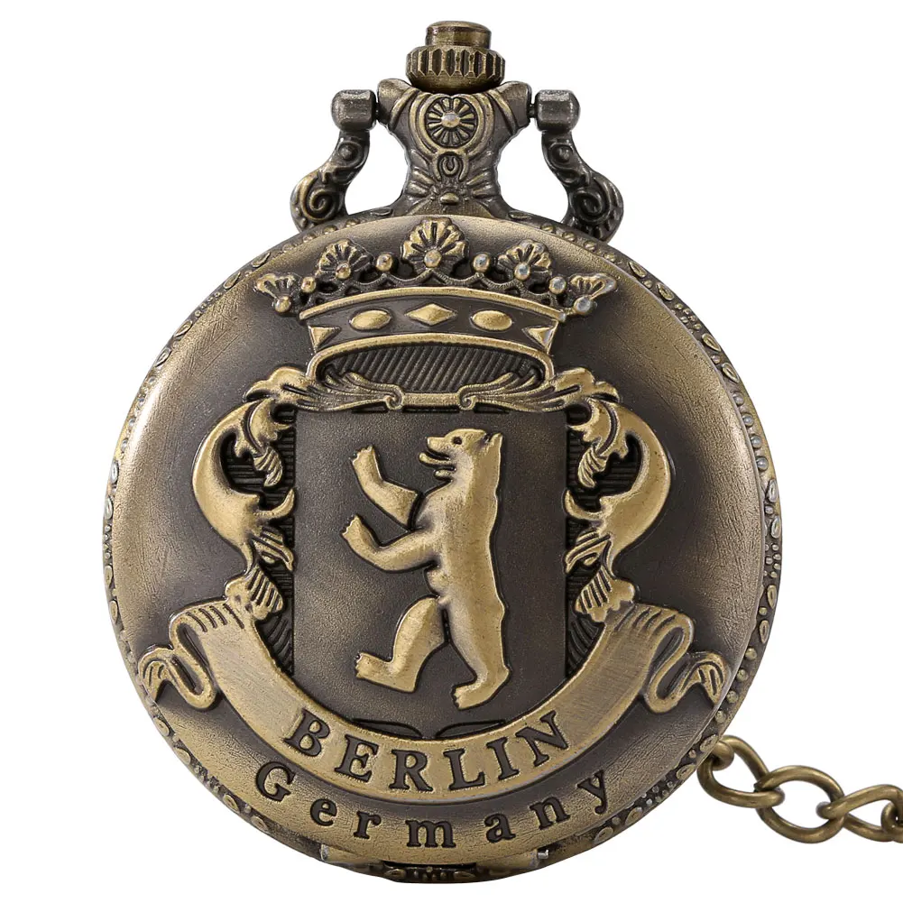 Немецкие Берлинские Резные кварцевые карманные часы с бронзовым зеркальным циферблатом медведь Круглый циферблат часы на цепочке подарки для мужчин и женщин
