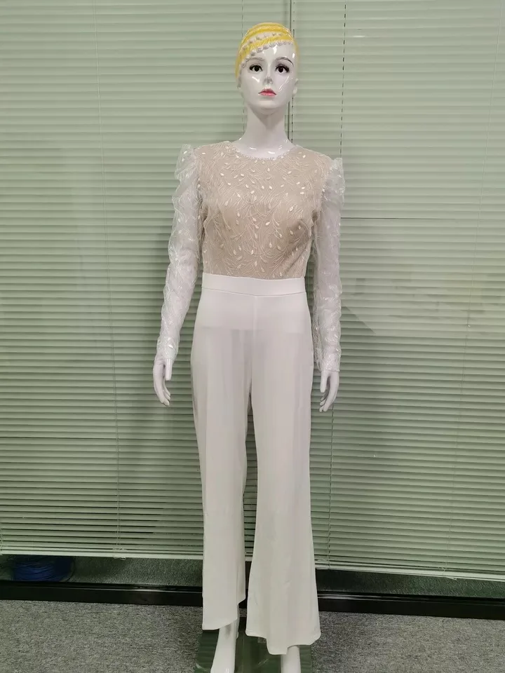 Комбинезон женский летний однотонный с круглым вырезом и длинным рукавом