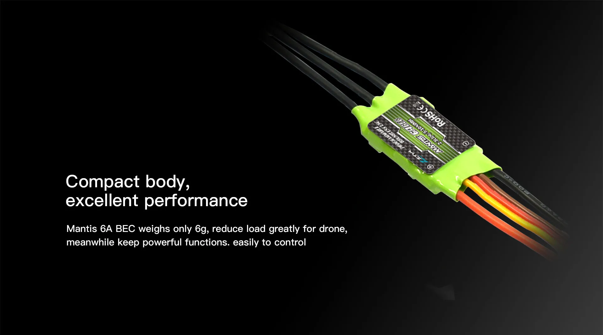 9. Использует MOSFET нового поколения для обеспечения низкой рабочей температуры ESC, поддерживая при этом самые большие Пиковые токи и более высокую надежность.