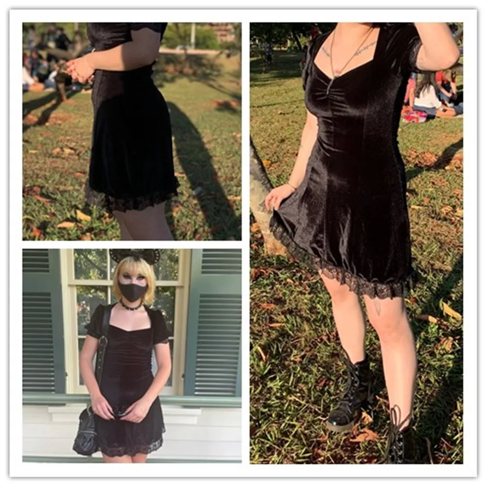 Винтажное кружевное черное платье Y2K Goth, черное жуткое сексуальное мини-платье с высокой талией, эстетичное кружевное вечернее Клубное платье трапециевидной формы с коротким рукавом
