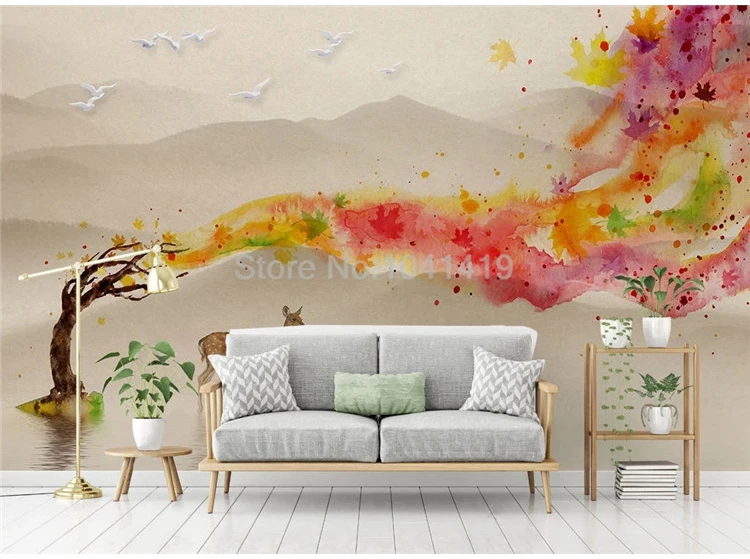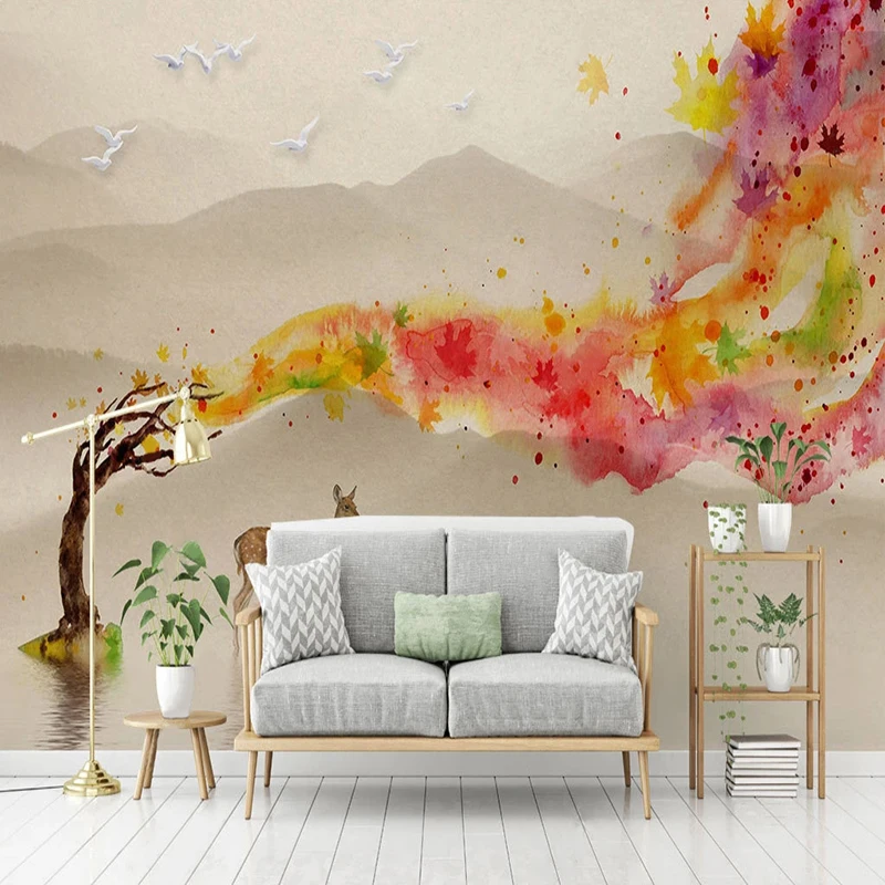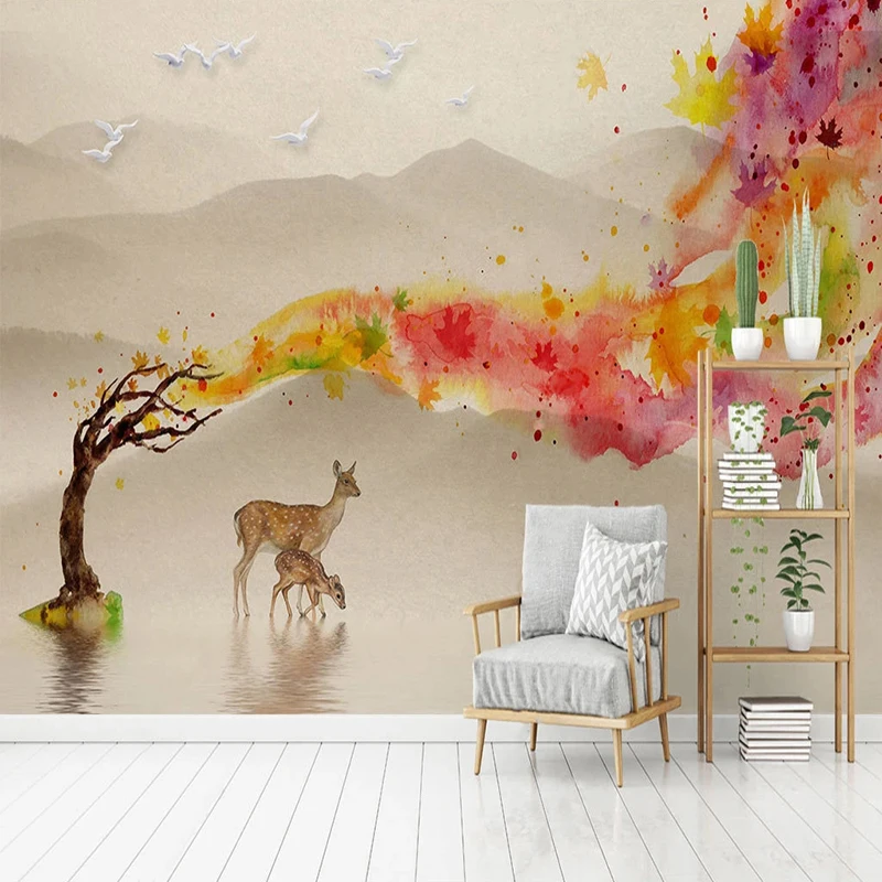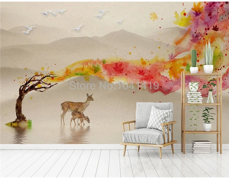 Пользовательские Настенные обои современный 3D акварельный пейзаж большое дерево Лось Гостиная ТВ диван фон настенная живопись Papel де Parede