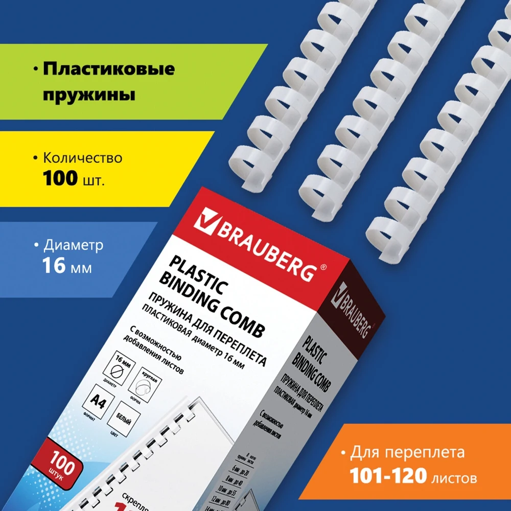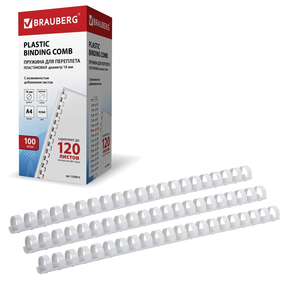 Пружины пластиковые для переплета BRAUBERG 530815 16 мм (для сшивания 101-120 листов) 100 шт, белый