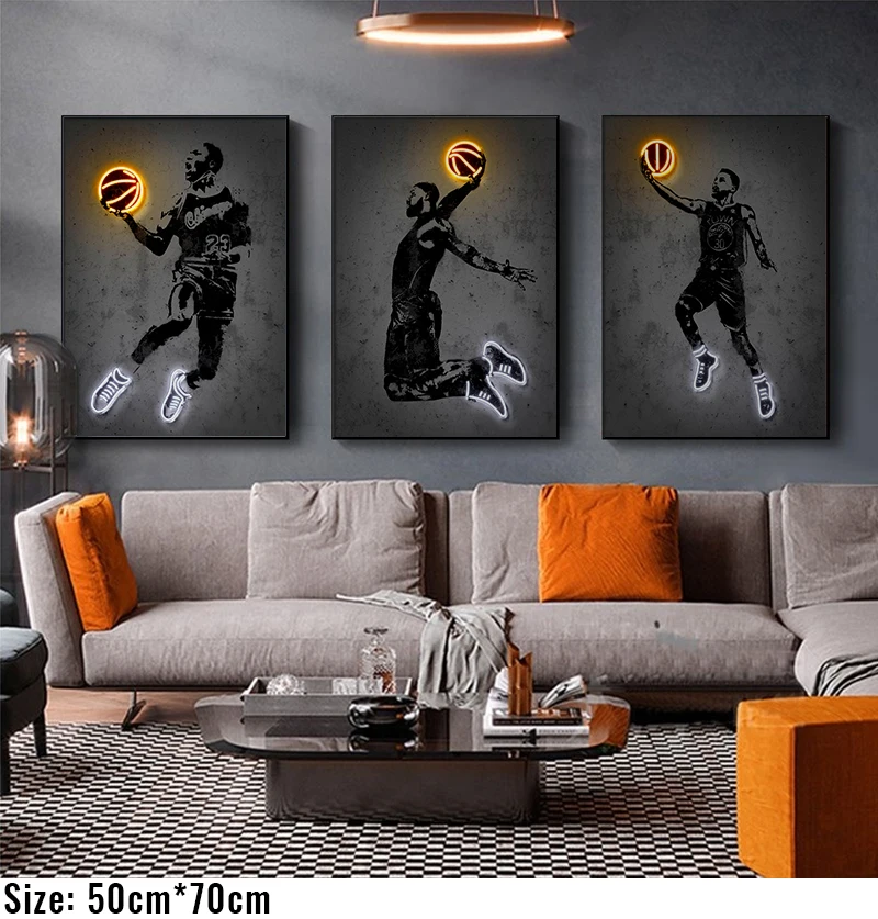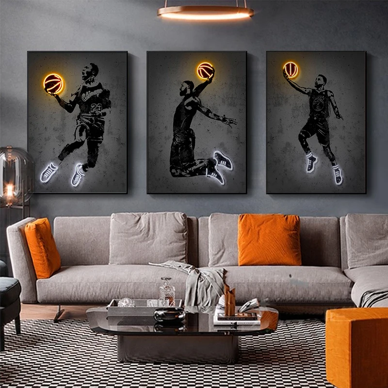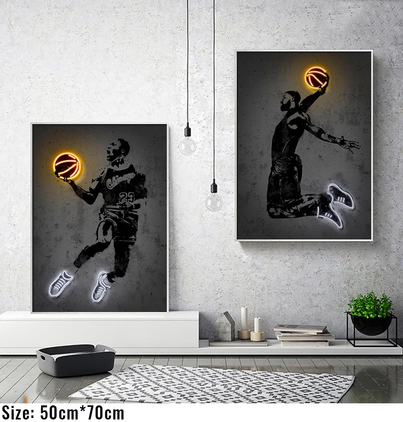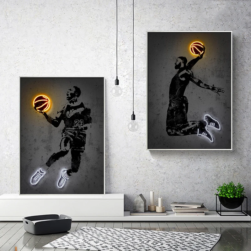 Баскетбольное настенное искусство, постер с неоновым принтом, уличное искусство, бетонные кирпичи, трафаретное искусство, неоновая вывеска, баскетбольный постер, спортивное искусство