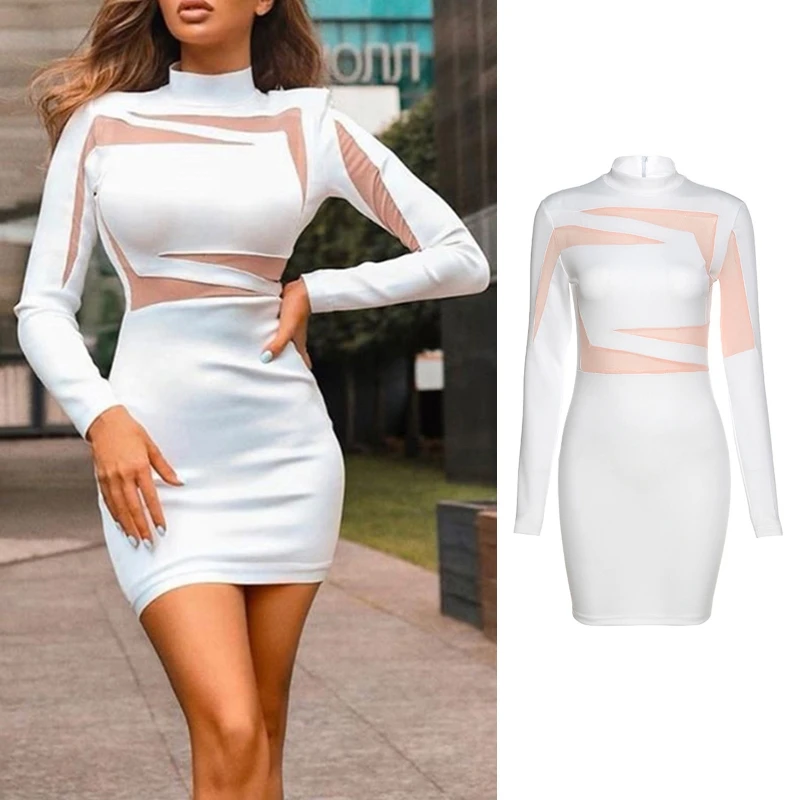 Женское облегающее мини-платье с длинным рукавом и высоким воротником, обтягивающее платье контрастных цветов с геометрическими полосками в стиле пэчворк, вечерняя Клубная одежда на бедрах