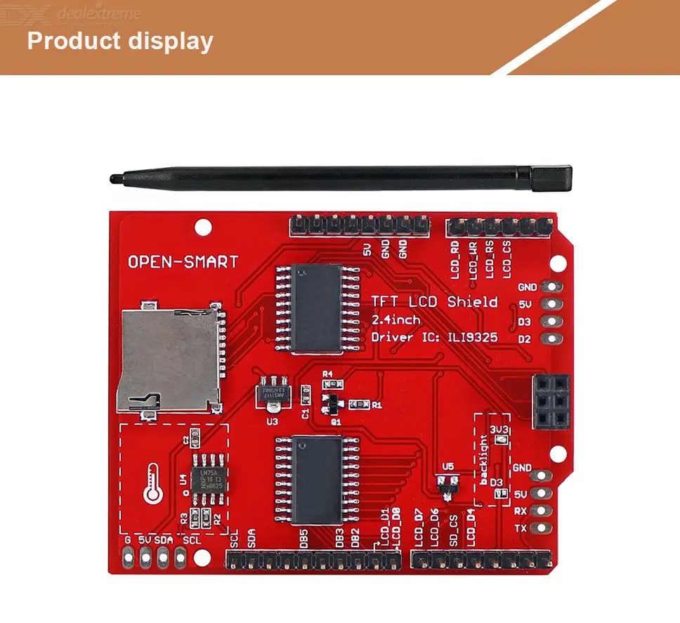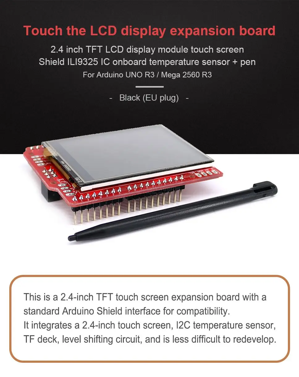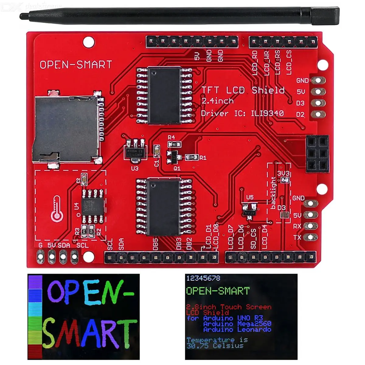 Это плата расширения сенсорного экрана TFT 2,4 дюйма с использованием стандартного интерфейса Arduino Shield и хорошей совместимостью. Он объединяет 2,4-дюймовый сенсорный экран, датчик температуры I2C, TF 2,4, схему преобразования уровня, а вторичная разработка менее сложна.С модулем GPRS вы можете спроектировать свой телефон Arduino.С модулем считывания NFC вы можете создавать системы контроля доступа с фотографиями.-Может использовать его напрямую для отображения символов, графики и изображений в формате BMP. И сенсорное управление доступно;-Совместимость: поскольку SD-карта подключена к контактам SPI интерфейса ICSP, совместима с Arduino UNO R3 / Arduino Mega2560 / Arduino Leonardo-Библиотека Arduino: TFTLib и adafrсекто_gfx;-Тип сенсорного экрана: резистивный сенсорный экран.-Сенсорная ручка: длина 9 см;-Разрешение: 240x320;-Размер дисплея: 2,4 дюйма;-Рабочее напряжение: 5 В;-Логический уровень: 5 В/3,3 В;-Бортовая Схема регулятора 3,3 В/мА;-Рабочий ток: максимум мА-Используйте контакты A0 ~ A3, D4 ~ D13. И интерфейс I2C, D0 / D1 / D2 / D3 доступен, пожалуйста, обратитесь к схеме продукта для получения подробной информации.-Встроенный слот Micro SD, поддержка карт Micro SD / TF;-Встроенный датчик температуры LM75: адрес I2C по умолчанию-0x48, шкала-55 ~ 125 °C-Отлично подходит для DIY