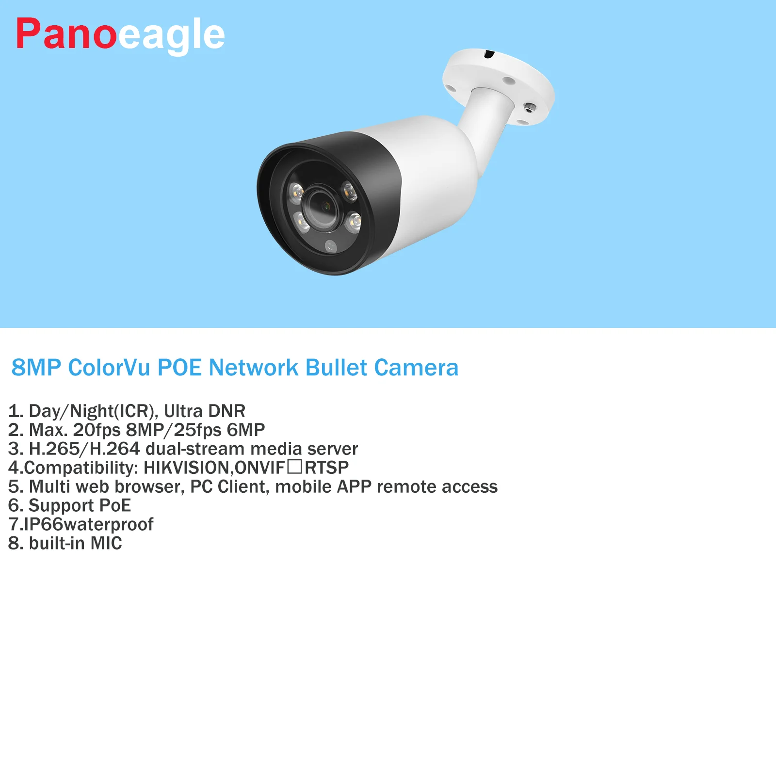 · День/Ночь (ICR), ультра DNR· Макс. 20fps 8MP/25fps 6MP· H.265/H.264 двухпотоковый медиа-серверСовместимость: HIKVISION, RTSP· Мульти веб-браузер, ПК клиент, мобильное приложение удаленного доступа· Поддержка PoE· Ip66водонепроницаемый· Встроенный микрофон