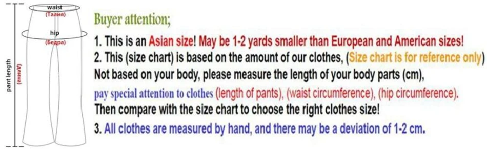 1. Все измерения выполнены вручную, возможны отклонения на 1-2 см.2.Обратите особое внимание на длину брюк и обхват талии (обхват бедер).3. Цвет проекта может немного отличаться, потому что различные виды компьютерных мониторов могут иметь несколько разные цвета.
