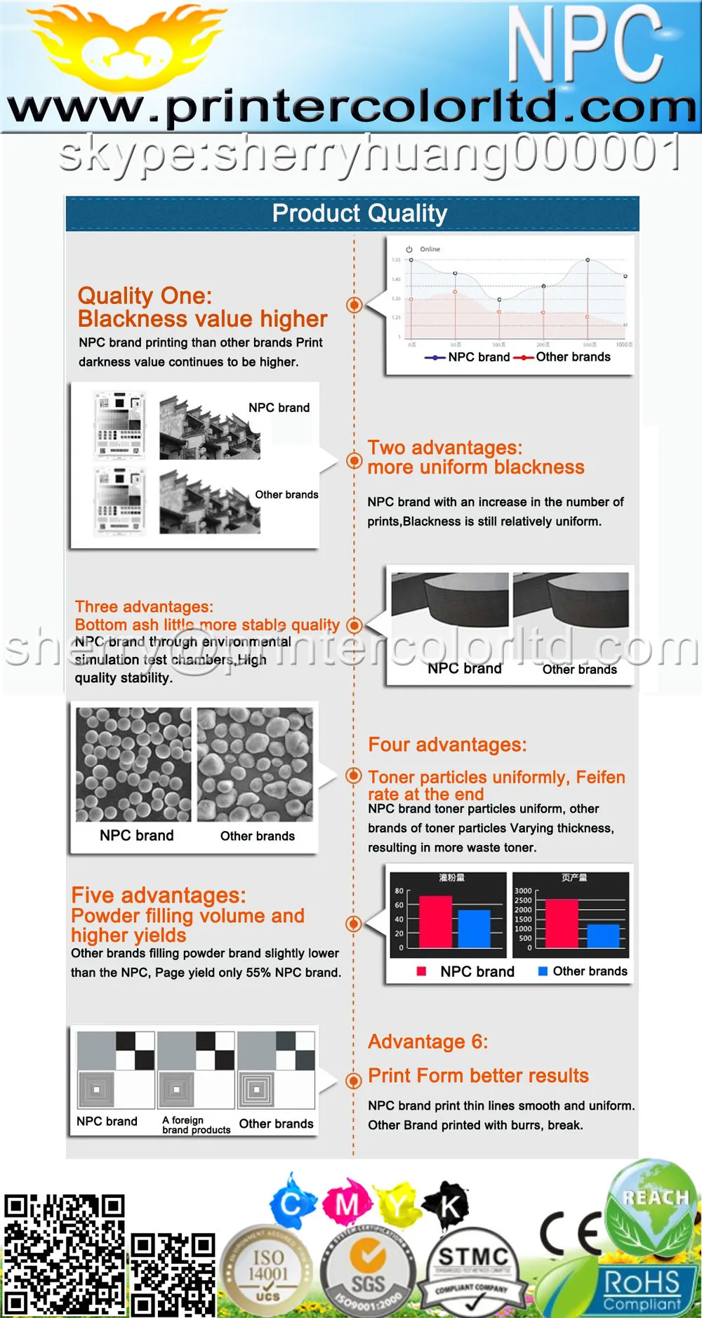 7. Все Тонер-порошок проводится один за другим в вакуумной утечки испытательных машин, чтобы обеспечить отсутствие утечки во время доставки8. Черного цвета, резкость эффекта печати может соответствовать или превосходить OEM9. Строгий контроль качества во время производства и 100% тест на печать перед отправкой