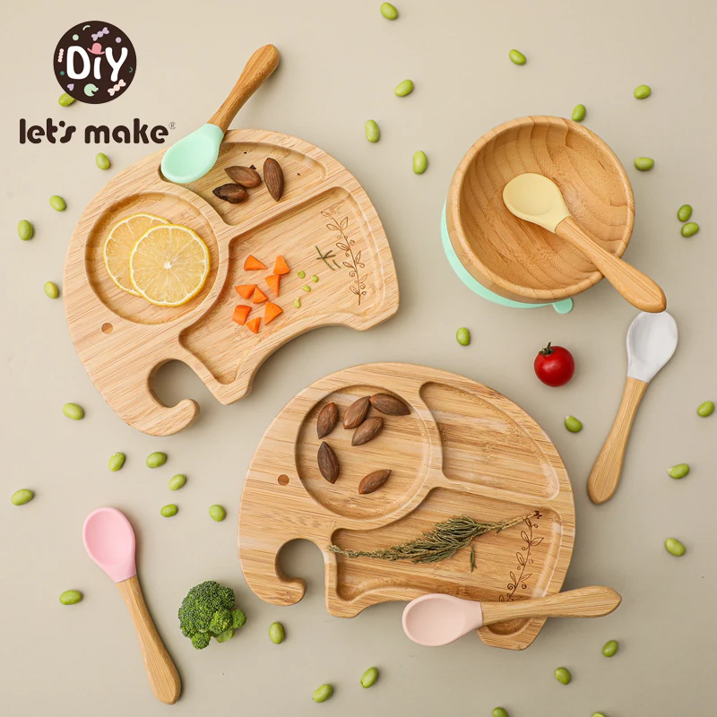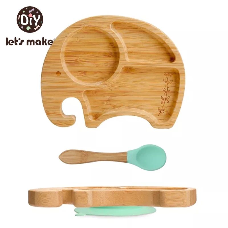 Детская миска для кормления Let's Make, обеденная тарелка, мультяшный слон, Бамбуковая тарелка на присоске, столовая посуда для младенцев, набор