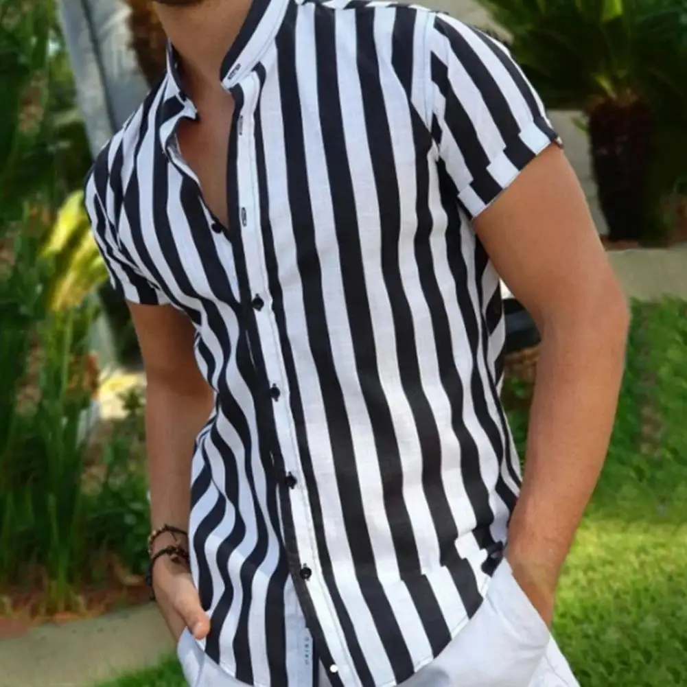 Мужская рубашка в полоску, с воротником-стойкой и коротким рукавом