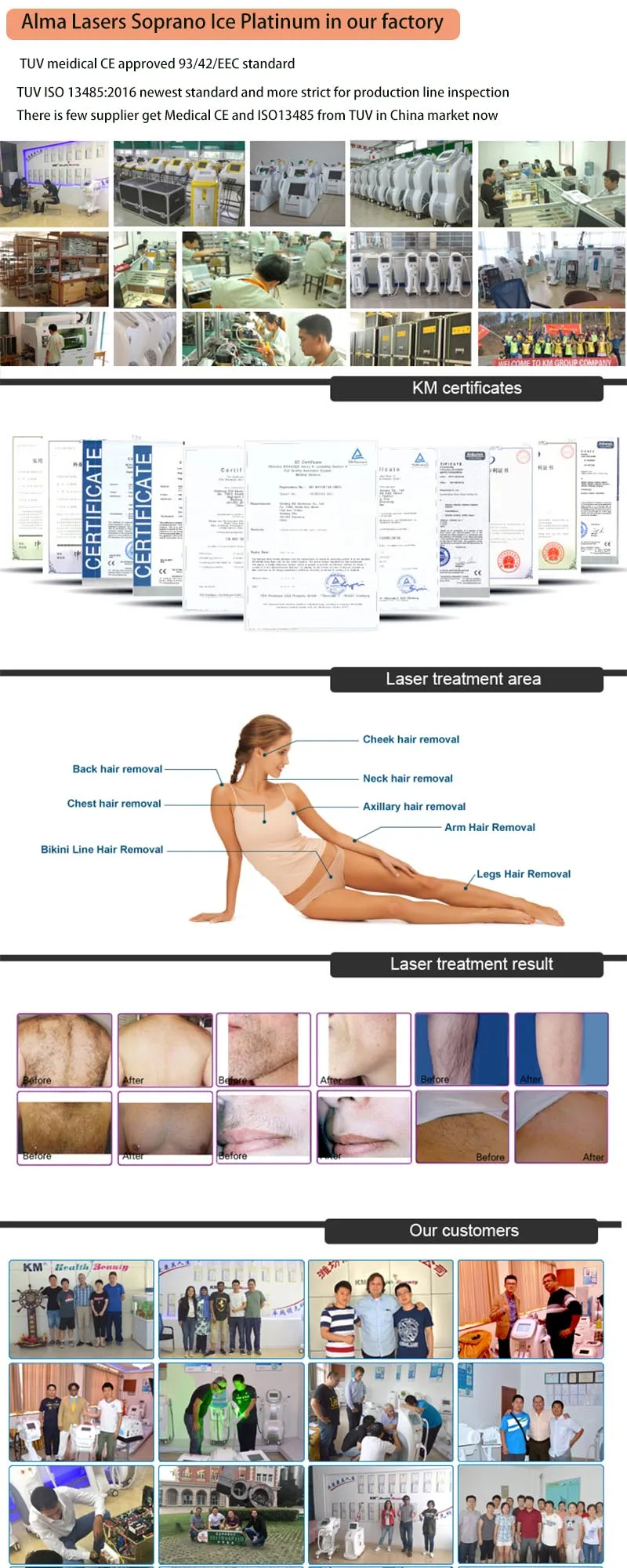 ·Alma сопрано ледяной Платиновый лазерПозволяет светильник глубже проникать в кожу и безопаснее, чем другие лазеры, потому что он может избежать пигмента меланина в эпидермисе кожи. Мы можем использовать его для постоянного уменьшения волос всех цветов волос на всех 6 типах кожи, включая загорелую кожу.