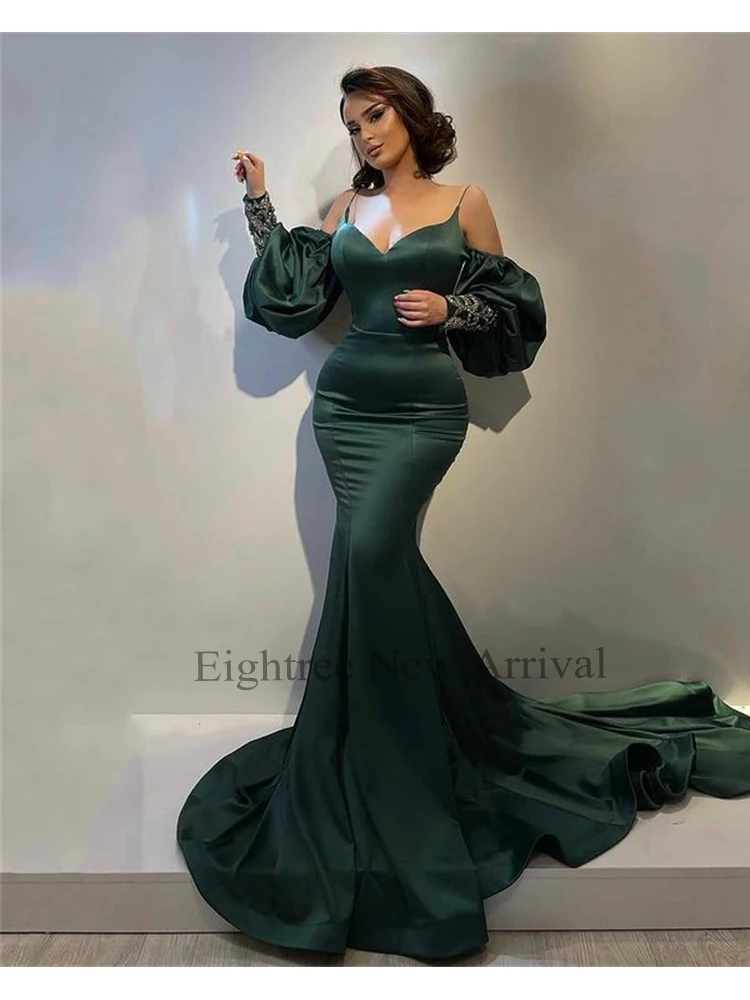 Длинное вечернее платье-Русалка с рукавами-фонариками и открытыми плечами