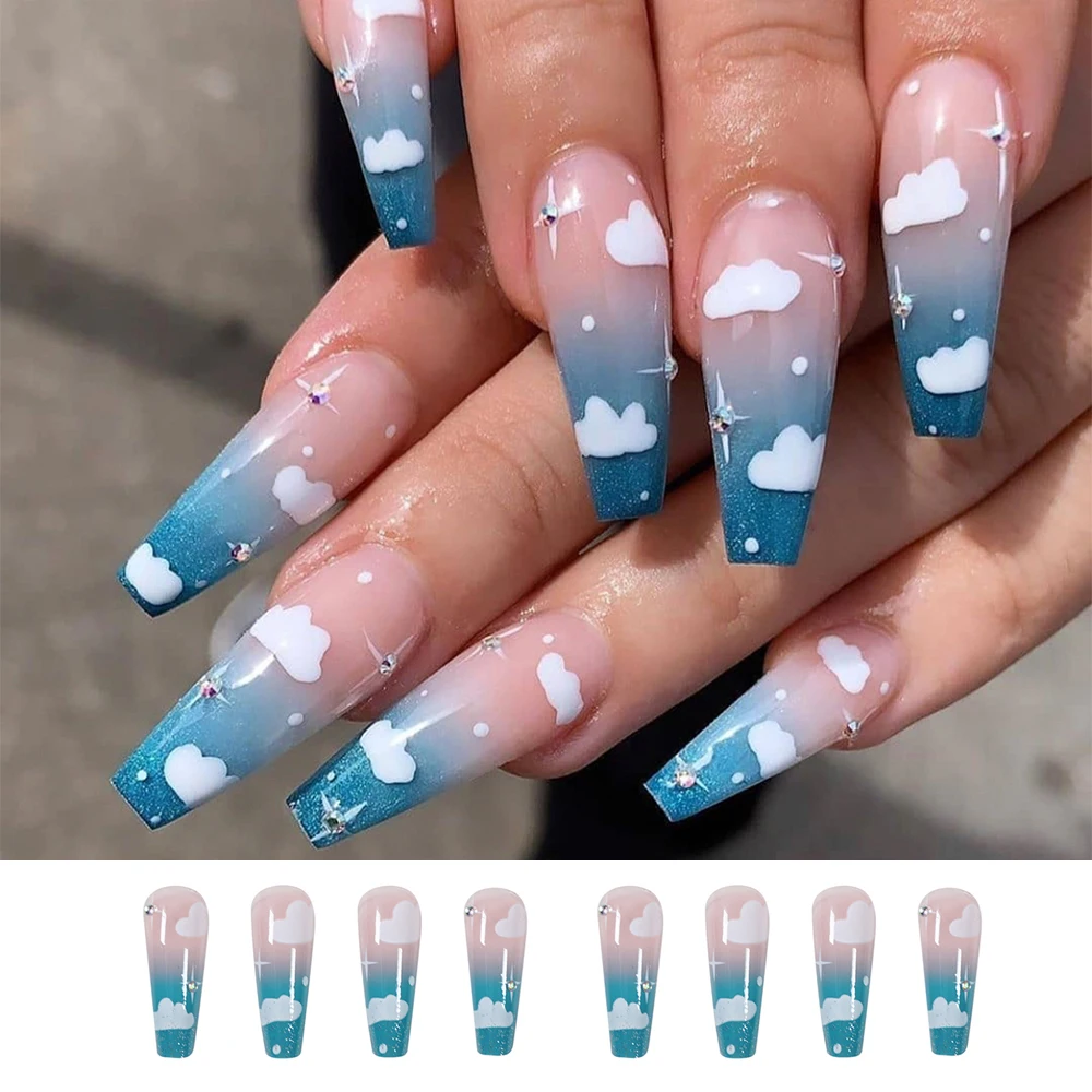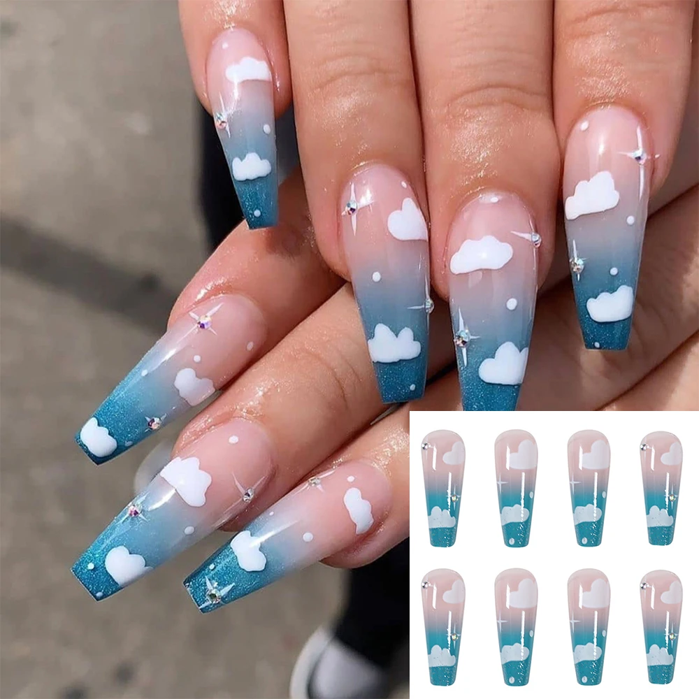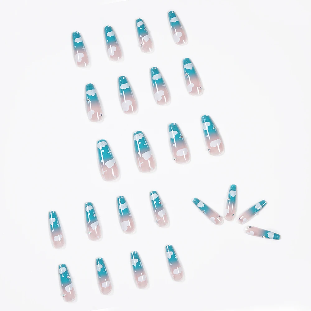 24 шт.кор. носимые Длинные накладные ногти балерины гроб синее небо белое облако узор полное покрытие накладные ногти Типсы дизайн ногтей Декор