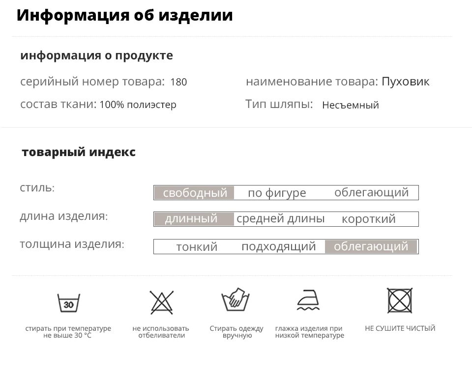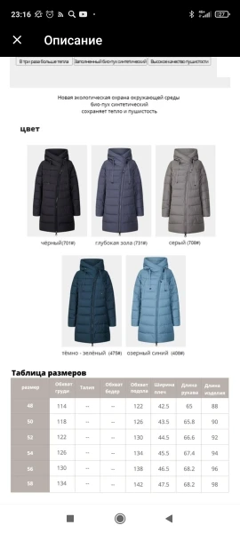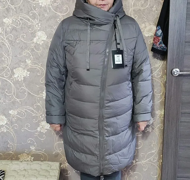 Почитав отзывы, на свой 50-й русский взяла размер 52 XXL - капельку великоват, но в моде нынче оверсайз, и зимой поддеть свитер есть место. Цвет немного темнее, чем на фото, но так даже лучше - менее маркий. Очень понравилась молния наискосок, плотно закрывается капюшон, но пуховик на не очень холодную зиму, по ощущениям.