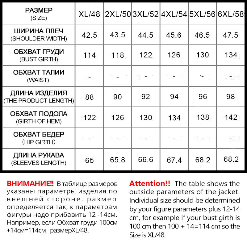 Куртка очень красивая, качественно пошита , на 54 русский размер заказала 6хL,свободно можно пододеть и свитер,рукава длинноваты ,подвернула .Очень довольна покупкой СПАСИБО продавцу за товар и быструю доставку !!!