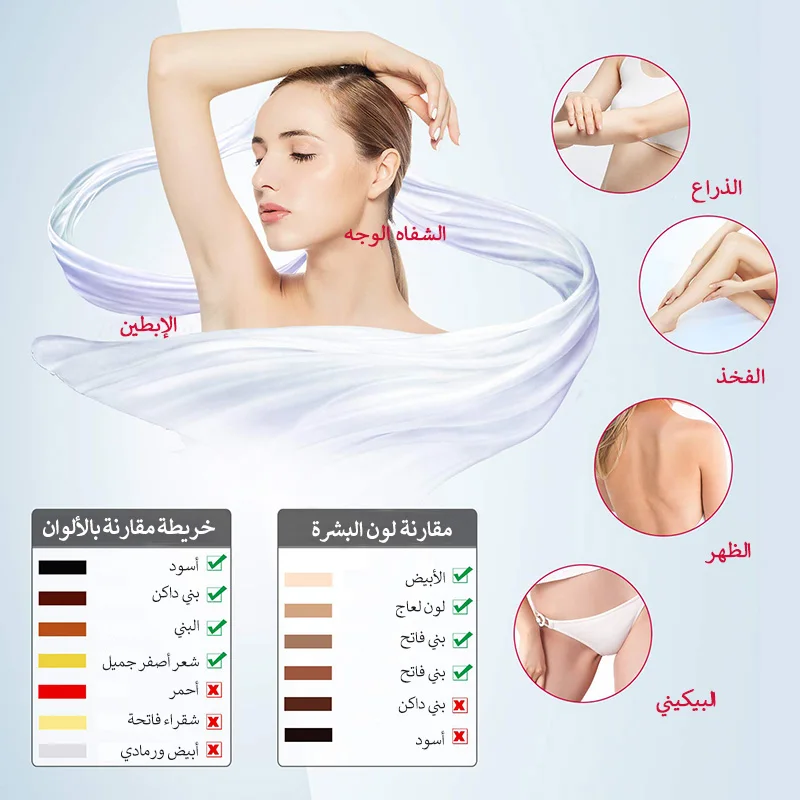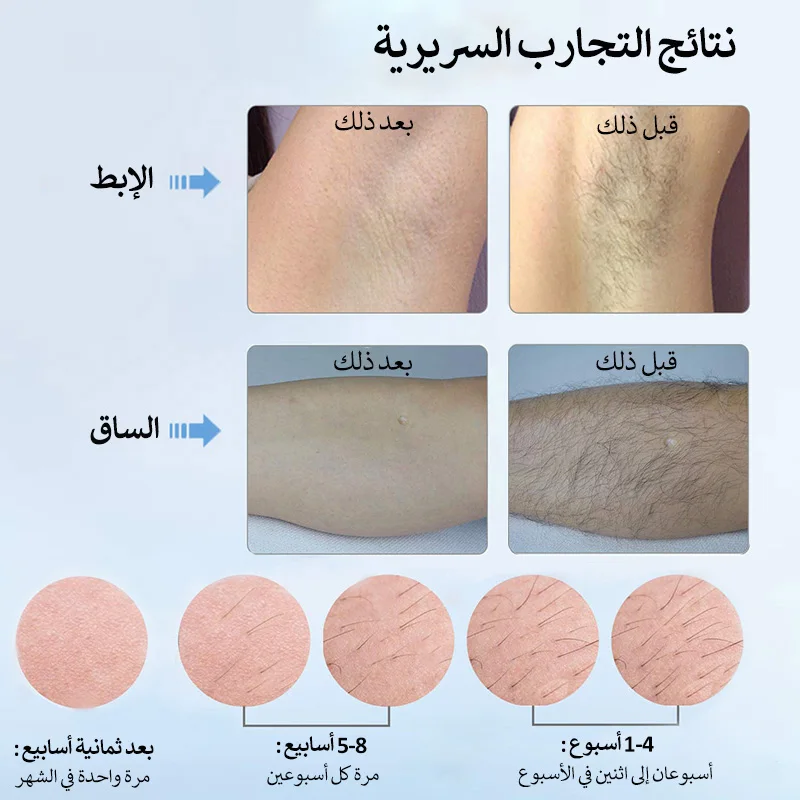 تقنية IPL الآمنة: يمكن لـ IPL (الضوء النبضي المكثف) أن يخترق البشرة ويمتصها بصيلات وتنعيم الشعر في الأدمة ، مما يؤدي إلى توليد الحرارة وتدمير بصيلات وتنعيم الشعر والمساعدة على كسر دورة تجديد وتنعيم الشعر الزائد. تمتعي ببشرة ناعمة وجميلة خالية من وتنعيم الشعر لمدة تصل إلى 8 أسابيع.