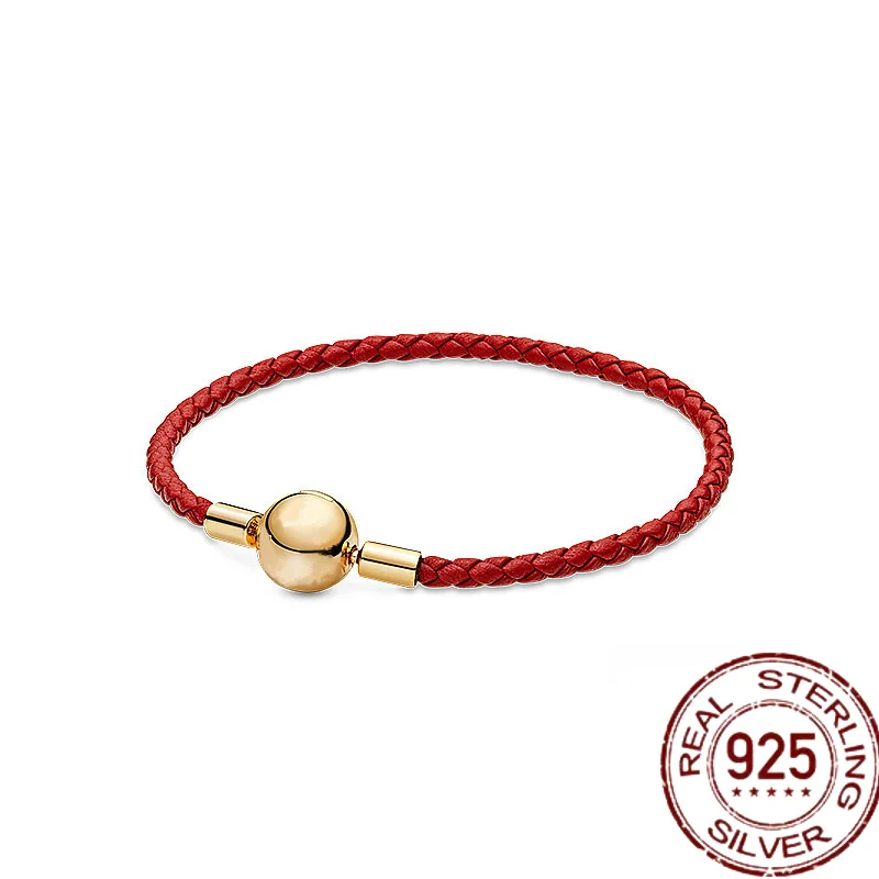 Женский браслет из серебра 925 пробы, золотистый кожаный шнурок, красная одинарная петля, круглая головка, Европейский Шарм-браслет сделай сам для изготовления ювелирных изделий