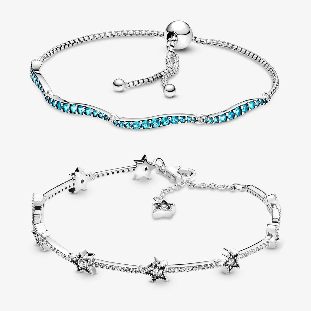 Браслет из стерлингового серебра серебристый цвет регулируемый пробы со звездами, браслет с волной подходящий к оригинальной бусине Пандоры для женщин, ювелирные изделия