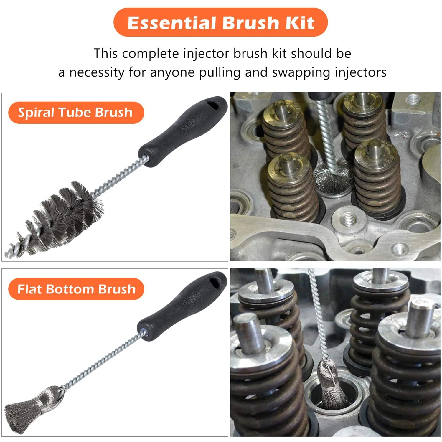 4. Специальные Особенности-Включает 1 спиральную трубную щетку из нержавеющей стали и 1 плоскую нижнюю щетку из нержавеющей стали. Этот инжектор в сборе кистей должен быть необходимым для тех, кто тянет и заменяет форсунки.