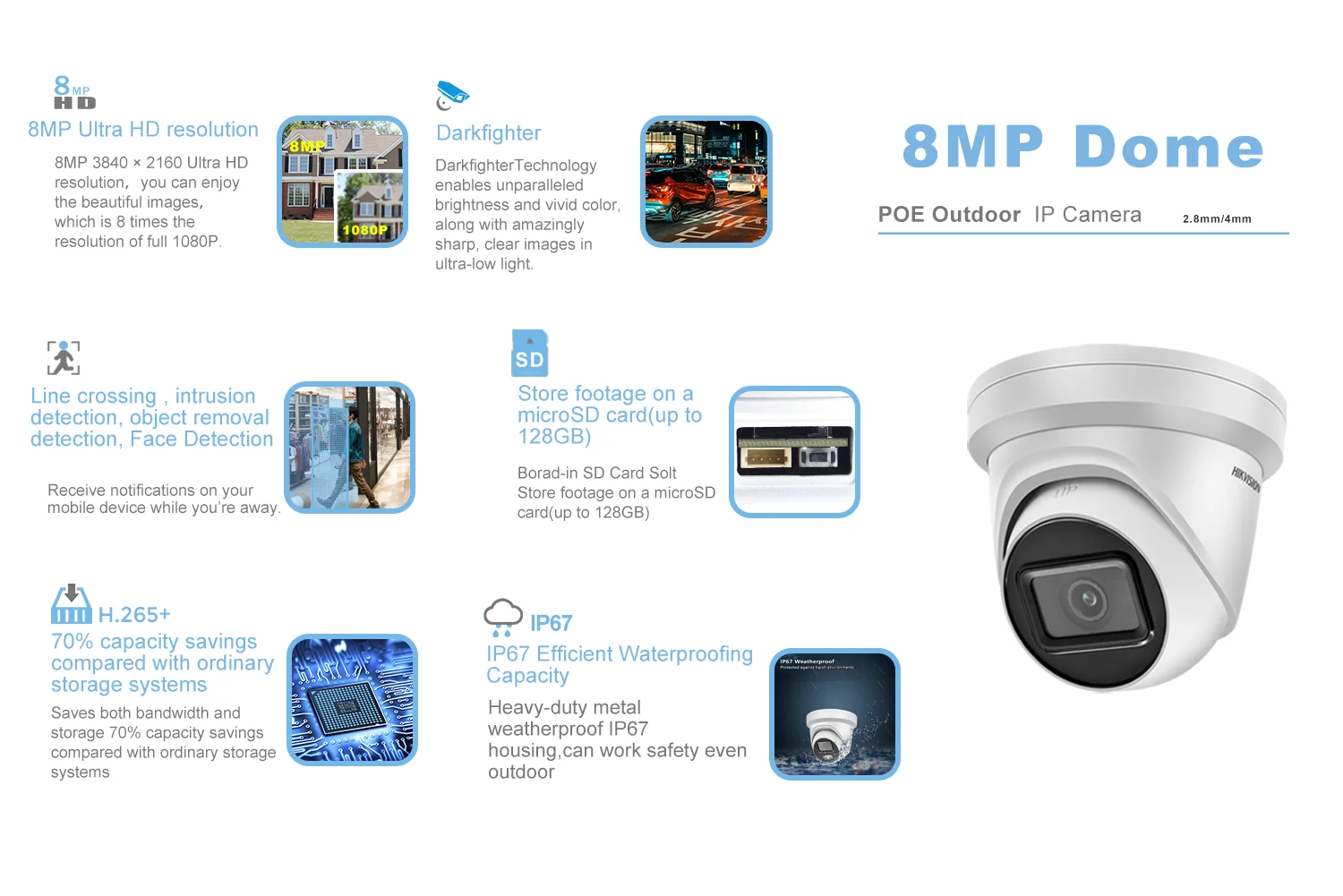 IP-камера Hikvision 8 МП 4K, DS-2CD2385G1-I H265 + POE Встроенная SD-карта, DarkFighter, наружная купольная камера видеонаблюдения, комплект