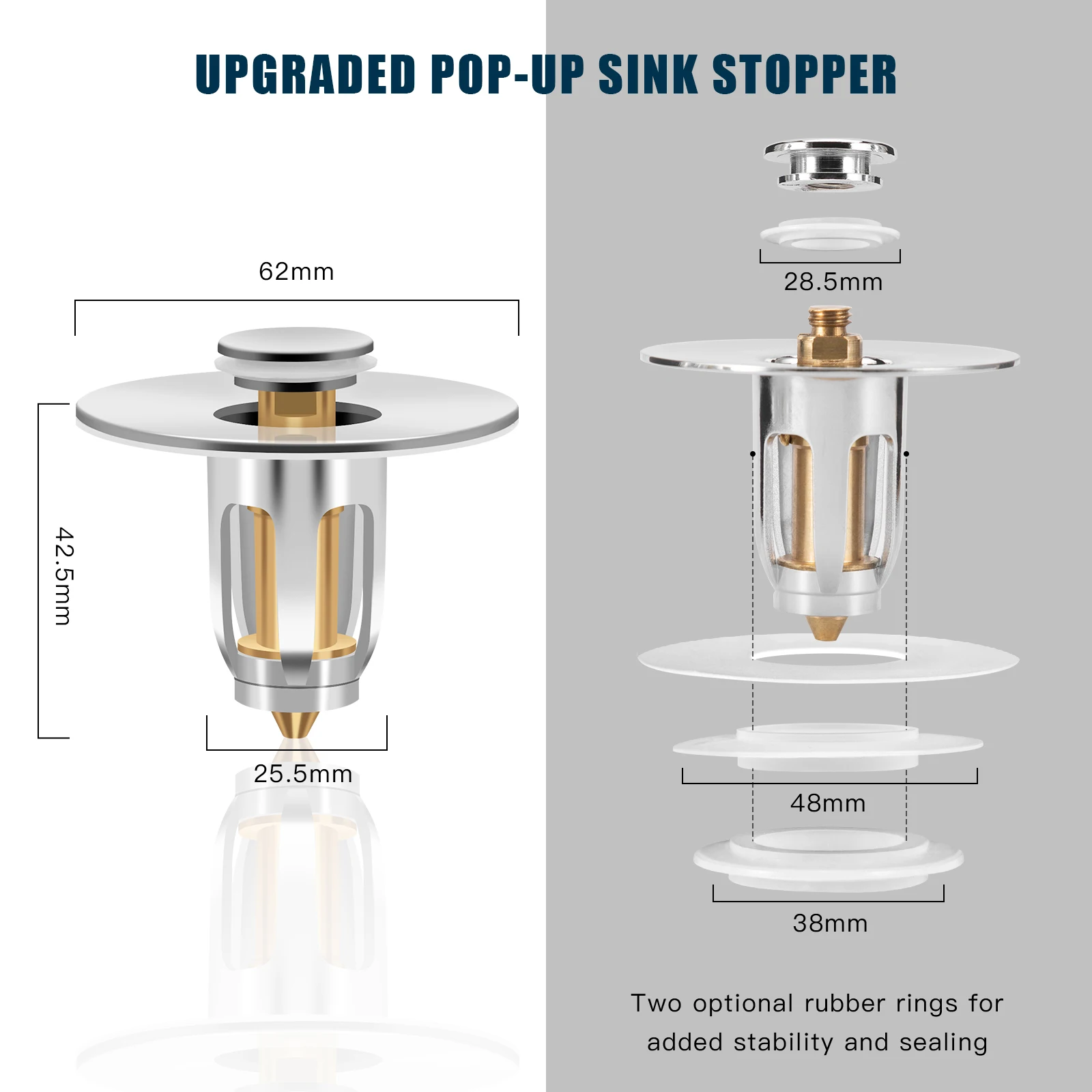 【 Встроенный STRAINER】В отличие от обычного стока с нажимной кнопкой, эта Стопорная пробка имеет сетчатый фильтр с защитой от засорения внутри, который аккуратно собирает волоски и предотвращает слив от засорения, материал, который не попадет в слив, такие как ювелирные изделия, кольца, грязь и так далее.