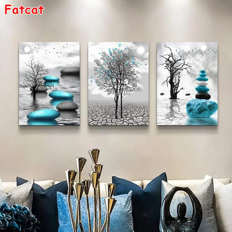 Триптих для алмазной вышивки крестиком, абстрактная синяя каменная елка, полная квадратная круглая Алмазная вышивка, 3 шт., Настенная Наклейка PP1891