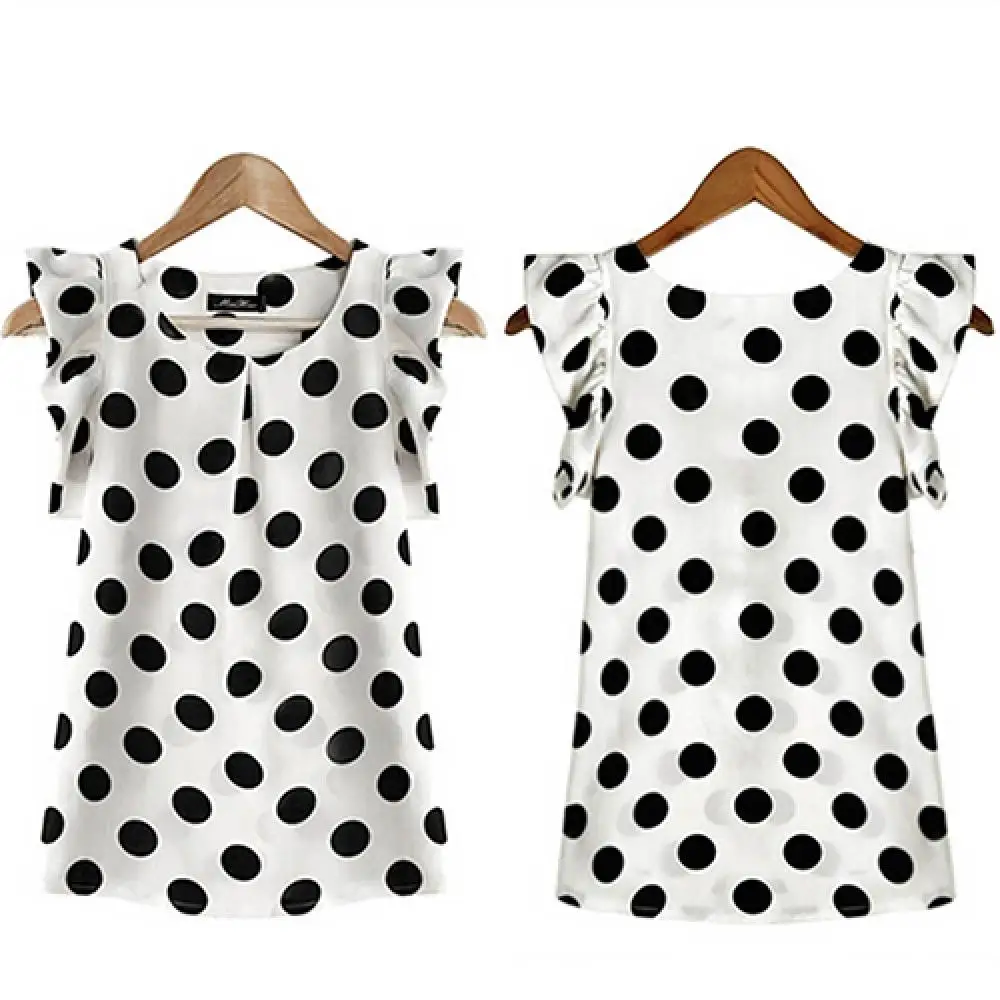 Женская шифоновая блузка, Повседневная летняя рубашка в горошек с круглым вырезом и коротким рукавом, 50%