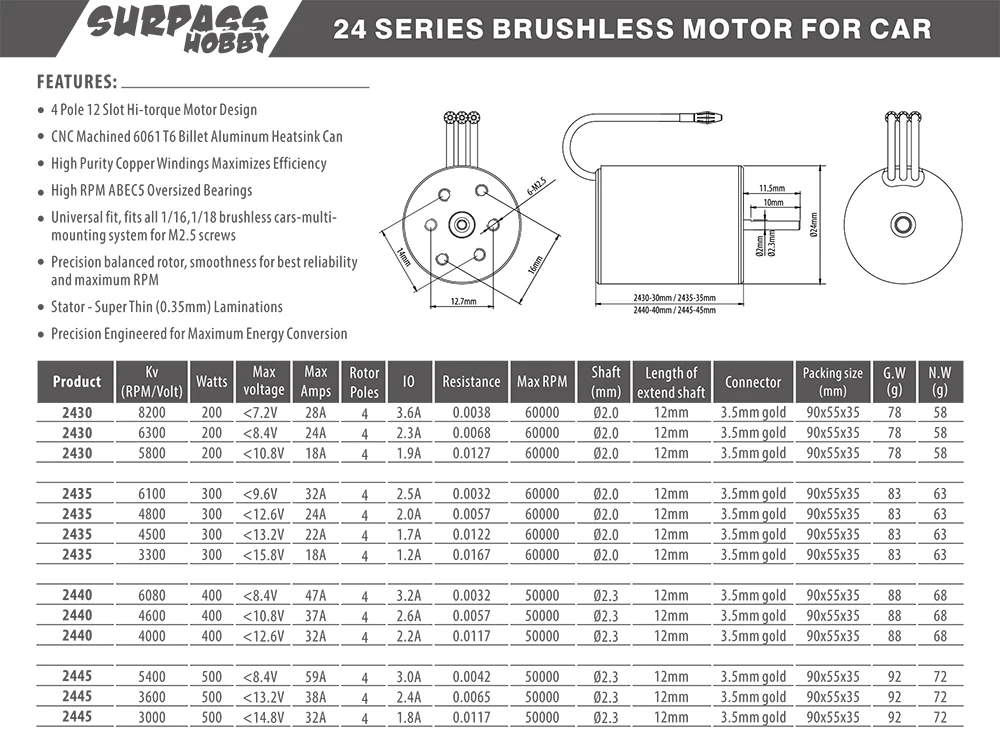 Водонепроницаемый мотор SURPASS HOBBY 2445 2,3 мм, 116 кВ, 3600кв, ...