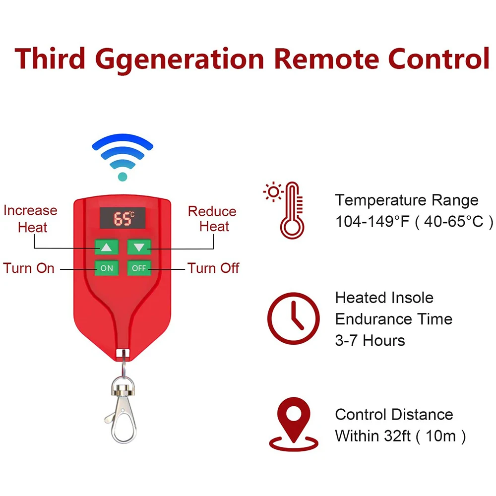 [Пульт дистанционного управления с цифровым дисплеем]:Большой диапазон температуры (40-65 градусов Цельсия). Вы можете шаг за шагом контролировать температуру стелек, и очень четко температуру стелек.