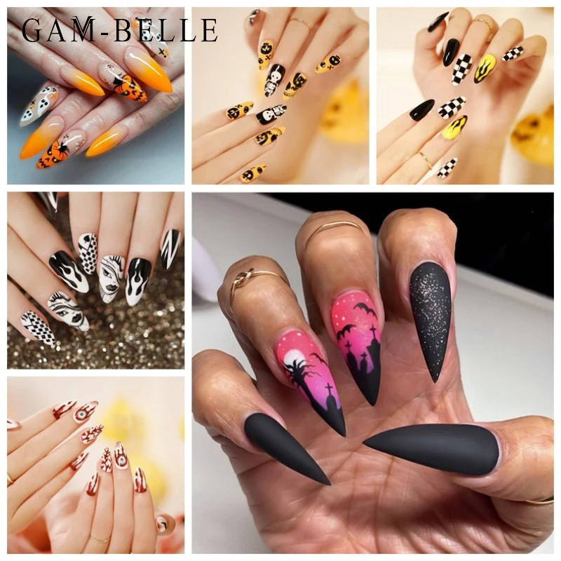 GAM-BELLE Съемные поддельные ногти французский стилет готический Хэллоуин серия полное покрытие искусственные накладные ногти аксессуары для маникюра
