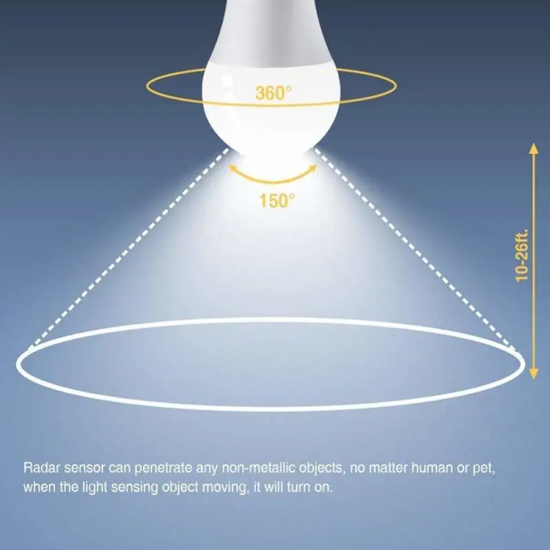Использование передовой технологии обнаружения радаров, которая более чувствительна и более проникает, чем инфракрасные датчики. Радарный датчик светильник лампочка может обнаружить motion, что на другой стороне стены, поэтому будет зафиксировано какое-либо движение в тех случаях, когда он обнаружения любого предмета при движении. (Толщина стенки должна быть меньше 8 дюймов).