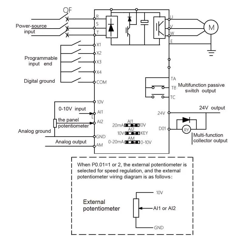 Программируемый аналоговый вход: AI1: 0 ~ 10 в вход, AI2: 0 ~ + 5 В или панель потенциометра вход