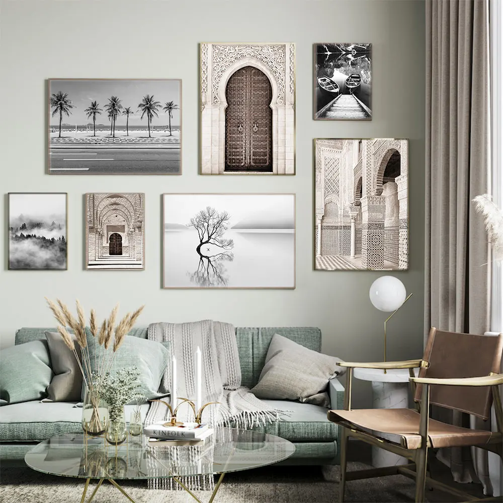 Постер на стену в скандинавском стиле с изображением сафьянской двери, Картина на холсте, архитектура, черно-белая лодка, дорога, пальма, настенные картины для декора гостиной