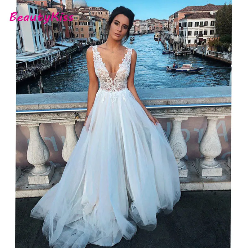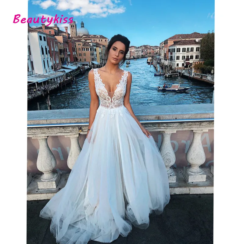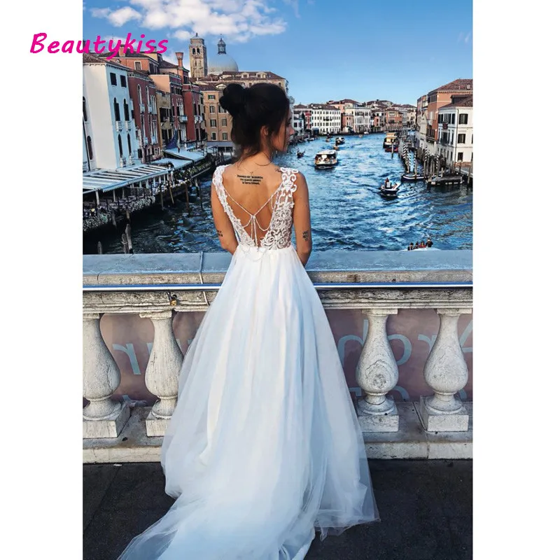 ТРАПЕЦИЕВИДНОЕ кружевное свадебное платье с аппликацией, сексуальное длинное Тюлевое платье с V-образным вырезом на бретельках для свадебвечерние, свадебные платья со шлейфом