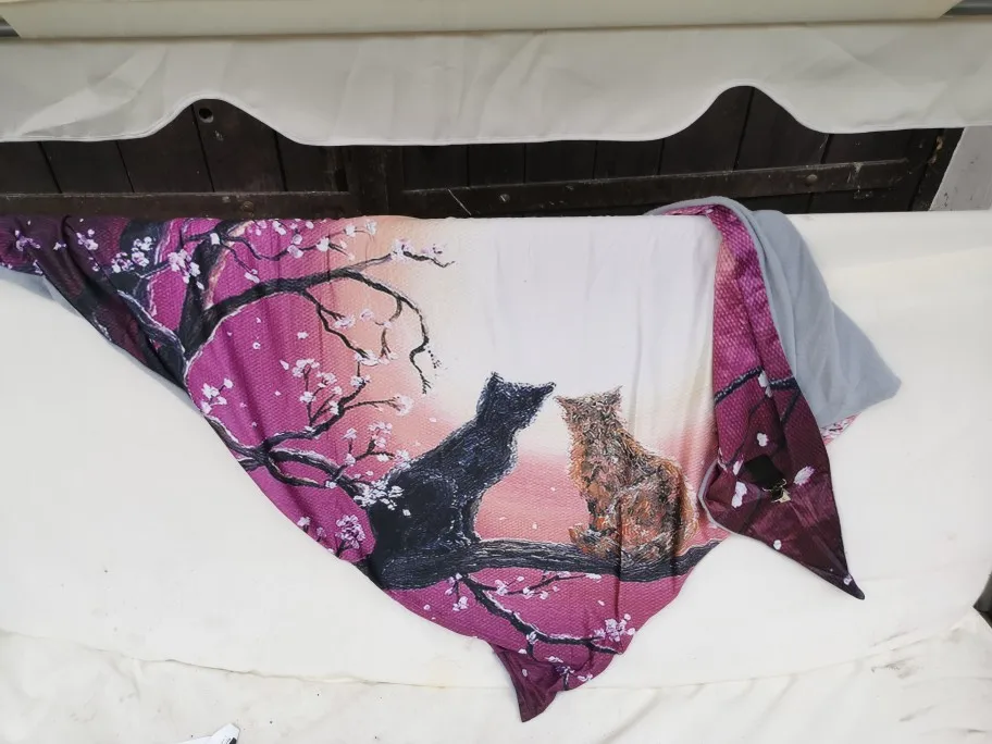 Все как в описании. Большая шаль. Цвета яркие. Неудобно, конечно, что сделано из двух разных кусков ткани соедененных только на швах. У меня застежка зажим, у дочи получше-пуговка. В целом пока довольны. Продавец очень хороший. Отвечал оперативно. Умничка. Всем бы таких продавцов.