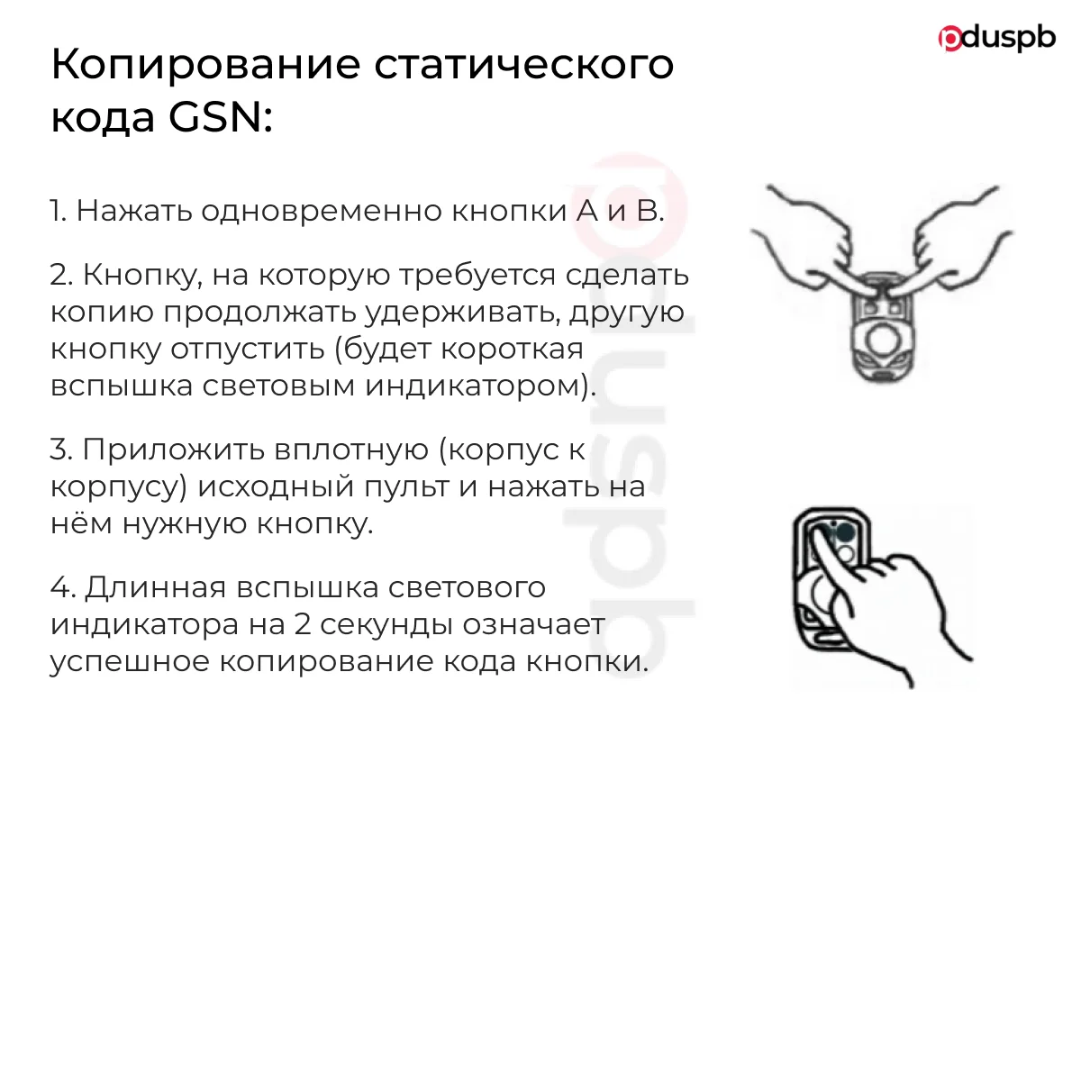 Одновременно нажмите и удерживайте кнопки A+B+D. Сразу и в течение 5 секунд световой индикатор не должен загореться. Если он загорелся - повторите попытку. Через 5 секунд световой индикатор выдаст длинную вспышку и погаснет. Сброс выполнен, кнопки A и B буду выдавать свой статический код для GSN.