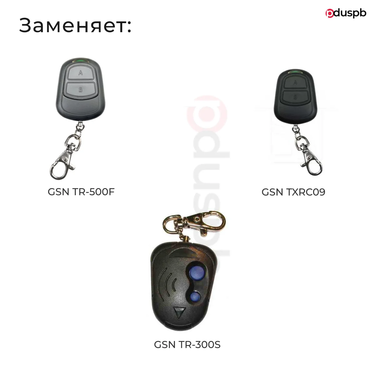 Пульт Atens для шлагбаумов и ворот может заменить пульт с фиксированным (статическим) кодом (GSN TR-500F) и пульт с плавающим (динамическим) кодом (GSN TXRC09) - будут добавляться в приёмник как оригинальные пульты. А также может скопировать статический код с уже добавленного в приёмник брелка GSN TR-500F.