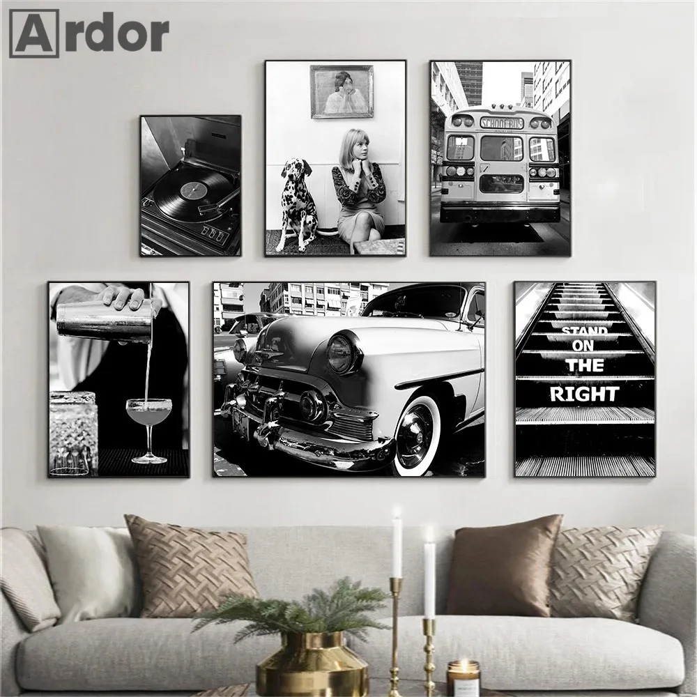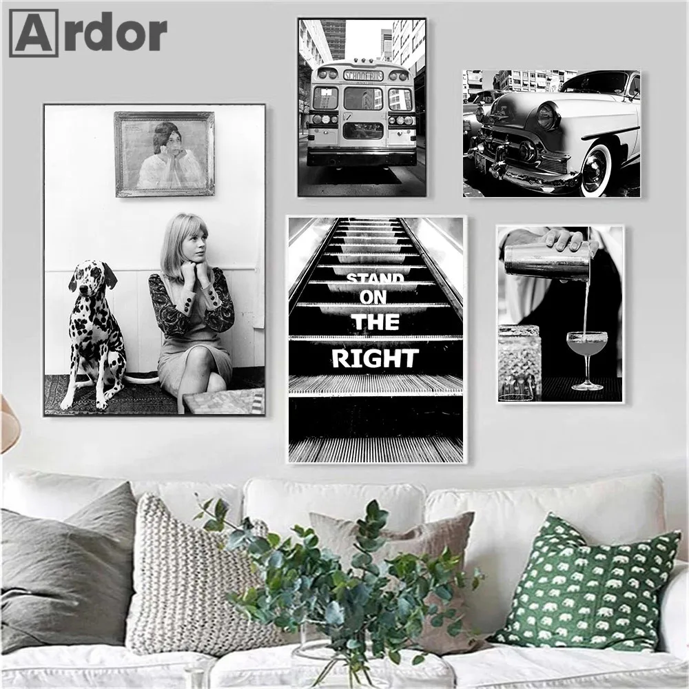 Винтажные плакаты и принты в виде автомобиля и автобуса, Постер в скандинавском стиле с изображением женщины, собаки, Черно-Белая настенная Картина на холсте, картины, домашний декор