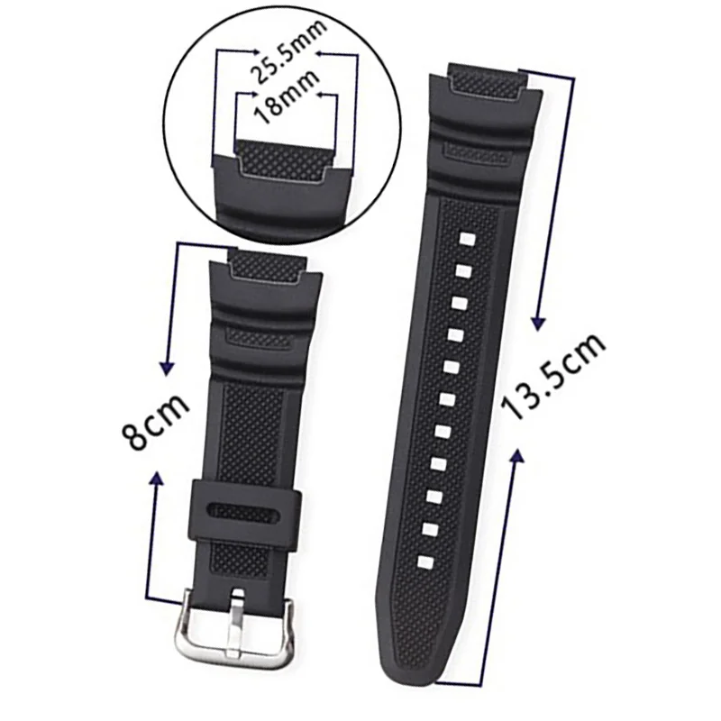 Ширина ремешка: 18 ммДлина: 80 мм (короткая часть) + 135 мм (длинная часть)Цвет: черныйМатериалы: Резина высокого качестваПряжка/застежка: Пряжка из нержавеющей сталиПодходит для: AE-1000w серии/AQ-S810W серии/SGW-400H / SGW-300HAQ-S800W / MRW-200H / W-735H / W-S210H / W-S200H / W-800H / W-752AEQ-110W / AE-1100 / SGW-500H