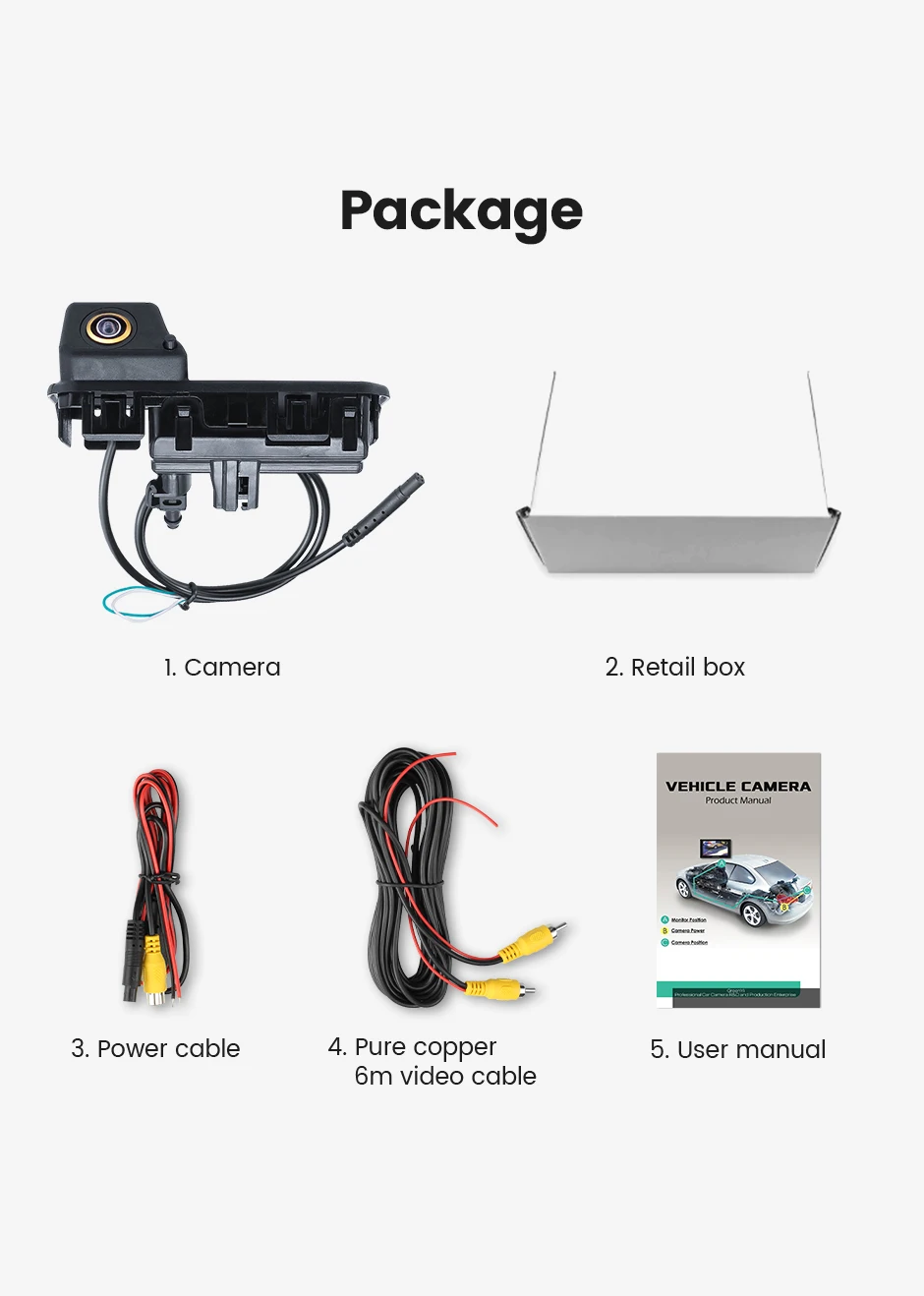 1. Камера заднего вида 2. Розничная коробка 3. Кабель питания 4. Чистый медный 6 м видео кабель 5. Руководство пользователя