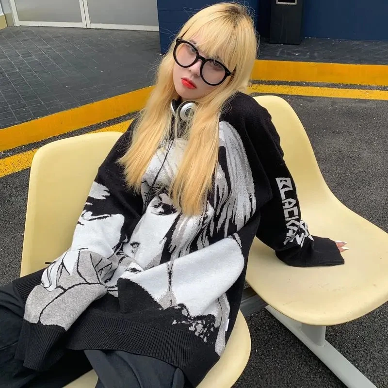 Женский свитер с аниме-принтом Deeptown, винтажный трикотажный пуловер с длинным рукавом, в стиле темной академии, 2021