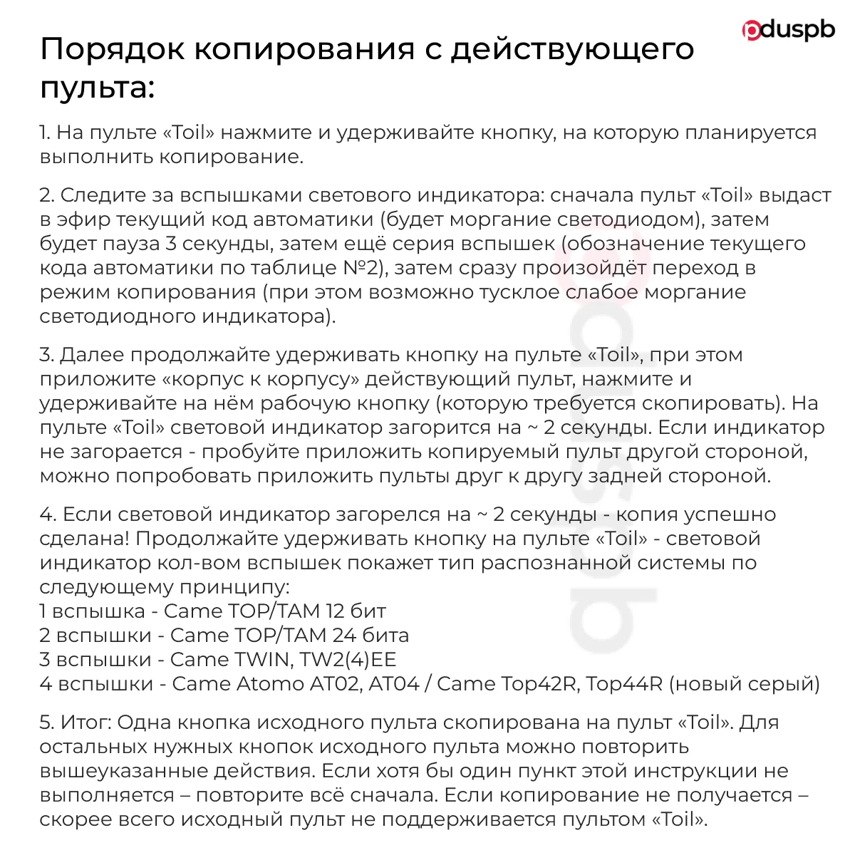 2. Следите за вспышками светового индикатора: сначала пульт «Toil» выдаст в эфир текущий код автоматики (будет моргание светодиодом), затем будет пауза 3 секунды, затем ещё серия вспышек (обозначение текущего кода автоматики по таблице №2), затем сразу произойдёт переход в режим копирования (при этом возможно тусклое слабое моргание светодиодного индикатора).
