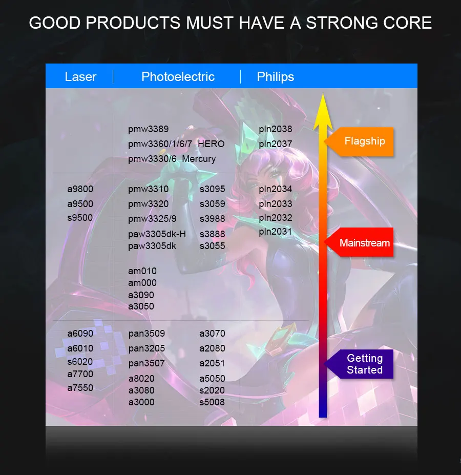 Основная модель нашей мыши-P3389, которая является лучшим ядром; >300 IPS;12000 FPS ,50G ACC,125/250/500/1000 Гц Частота опроса; высокоточный датчик обеспечивает точную точность во время игрПереключатель известен на международном уровне Omron, выдерживает 50 миллионов нажатий
