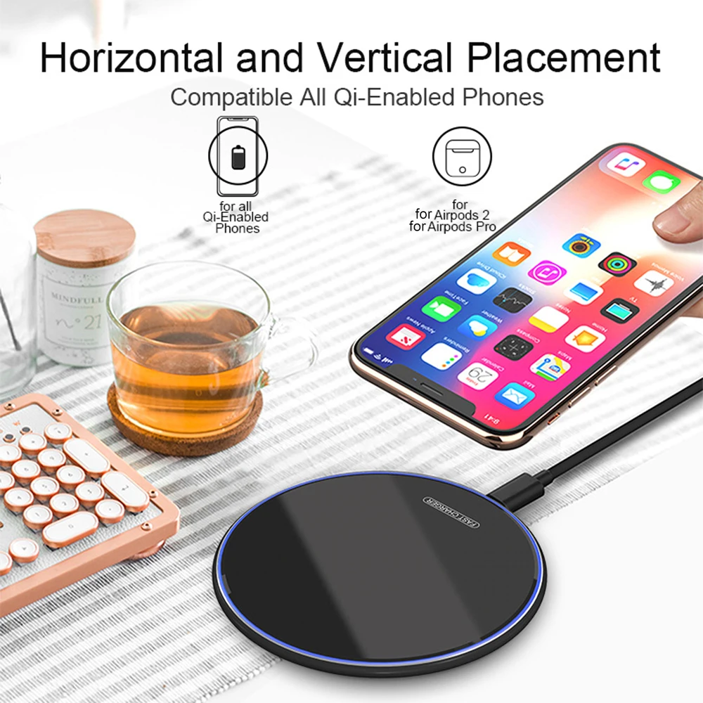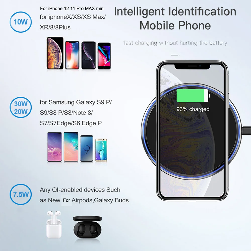 Более быстрая Беспроводная зарядка: режим быстрой зарядки 30 Вт совместим только с Samsung Galaxy S10/S9/S9 Plus/S8/S8 Plus/Note 9/Note 8/Note 5/S6 Edge/S7/S7 edge и другие товары серии Galaxy Note и Galaxy S, быстрая зарядка 7,5 Вт совместима с iPhone 12/11/11 pro/X/XS MAX/XR, iPhone8/8 plus, (Другие устройства с поддержкой Qi будут заряжать со стандартной скоростью беспроводной зарядки).